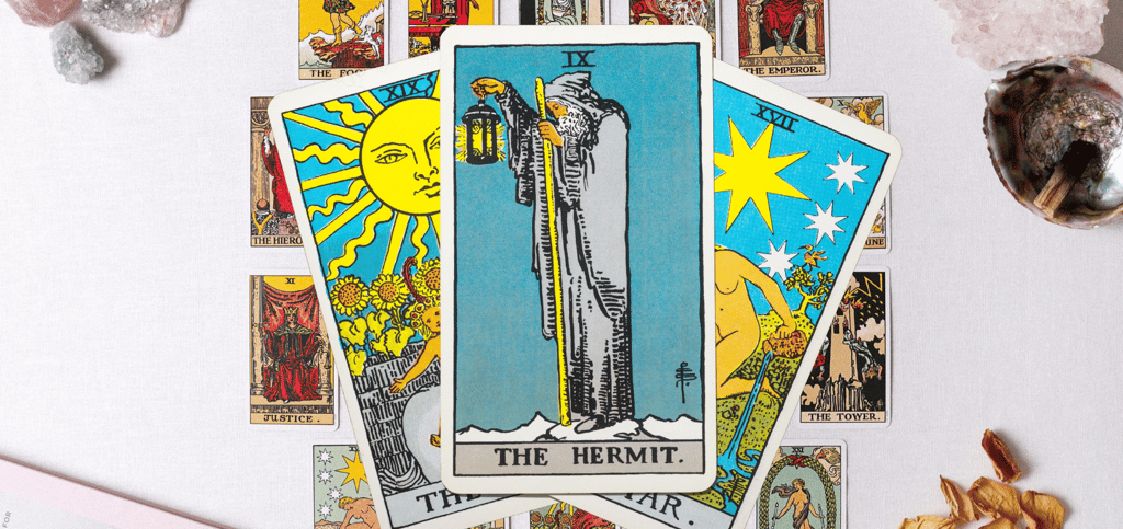 In the Rider-Waite version of tarot cards (the most commonly recognised deck), the Hermit is represented as a solitary figure of a cloaked old man holding a staff and lantern. The lantern indicates illumination from the unknown as he seeks enlightenment. The cloak is a form of discretion. This card in a reading can often represent the embodiment of inner awakening and sacred solitude. It can represent the soul’s yearning to turn inward from the noise of the world to seek wisdom from the quiet voice within, in the stillness.